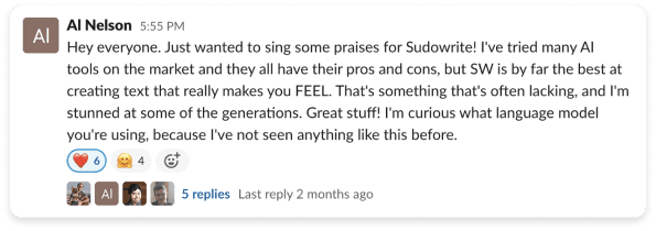 Sudowrite is a tool for creativity. It's not intended to write for you, but can help you vastly improve and speed up your writing. Just as a great writing partner can help you bust through when you're stuck or be a sounding board to bounce ideas off of, Sudowrite makes writing more fun, faster, and less solitary.